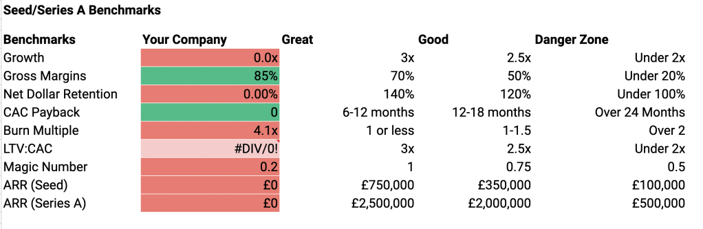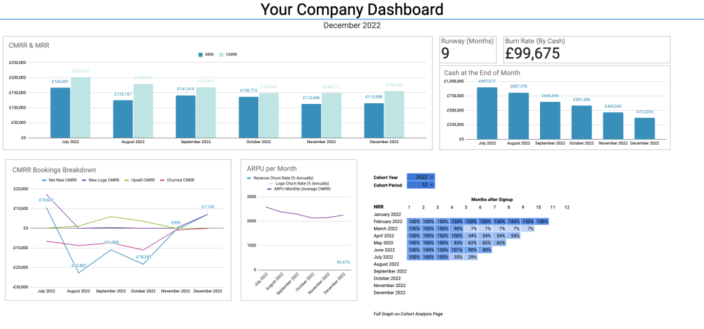 The ‘yellow’ labelled sheets are the ‘appendix’ areas which have lots of useful information that you need to read without graphs or formatting. For example, Month by Month metrics is a month by month breakdown of all of your metrics, and Cohort Analysis contains a full cohort analysis of your Net Retention Revenue.