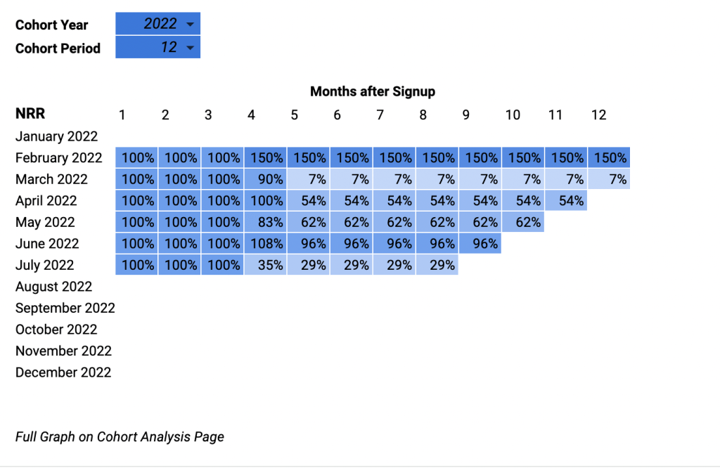 Most people choose a 12 month NRR, which means “of the customers you had twelve months ago, how much money do those customers spend with you now” or in the case of a cohort analysis, display the changes month on month.
